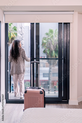 © Guillermo Spelucin, Obraz premium Digital nomad enjoying city view from airbnb balcony