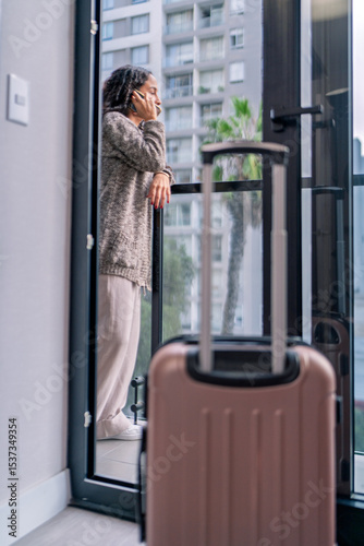 Fototapeta premium Digital nomad making a phone call on balcony of airbnb apartment