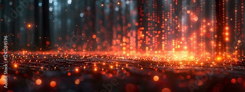 © Yuliia, Naklejka premium Digital orange glowing particles and light rays falling on dark reflective surface creating futuristic technology background with bokeh effect.