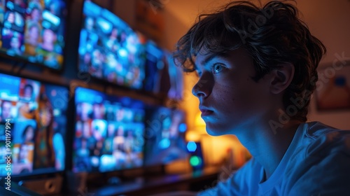 © DigitalMagicVisions, Obraz premium Digital Overload - Teenage Boy Engrossed in Screens with Tense Expression and Blue Light Illumination in Dim Room