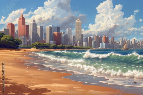 Naklejka premium Digital Painting of a Coastal Cityscape