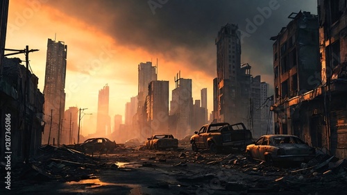 © Ferdinand, Obraz premium Digital Painting of a Ruined City at Sunset, Dark and Desolate Streets with Abandoned Cars
