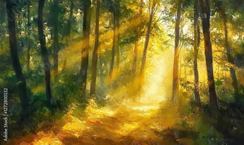 © Usha, Naklejka premium Digital painting of a serene forest with golden sunlight filtering through the trees, Generative AI