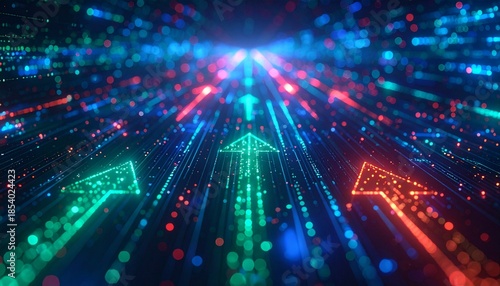 © photostockatinat, Fototapeta premium Digital Pathways: A dynamic visualization of technological progress, featuring illuminated arrows ascending amidst a vibrant network of data streams.