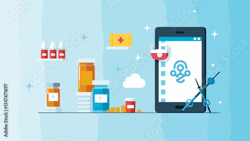 Obraz premium Digital Pharmacy: Mobile App for Ordering Prescription Medication & Health Supplies - Vector Illustration of Modern Telemedicine Service with Pills, First Aid Kit
