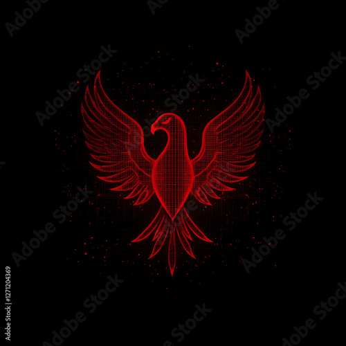 Obraz premium Digital Phoenix Rising From the Ashes in a Geometric Crimson Grid on a Black...