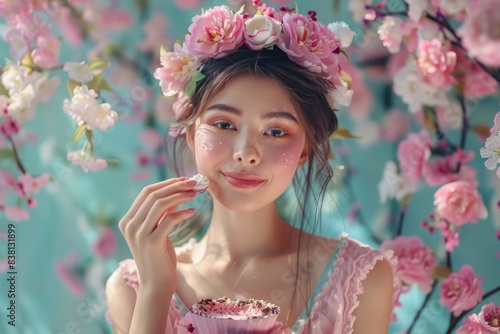 Obraz premium Digital portrait of an elegant woman holding flower petals, surrounded by...