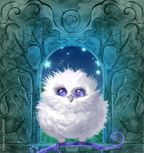 Fototapeta premium Digital raster cartoon illustration of a funny fluffy white owl with cosmic...