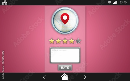 © vectorfusionart, Fototapeta premium Digital rating card UI is being shown on flat pink gradient background, featuring map pin, stars