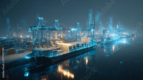 © DeepView, Obraz premium Digital Rendering of Container Port at Night