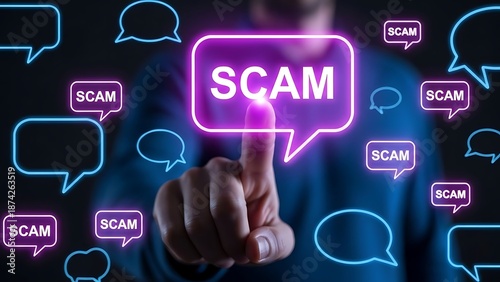 © Nipa, Fototapeta premium Digital Scam Concept With Speech Bubbles And Finger Press