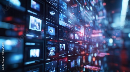 © Premreuthai, Obraz premium Digital screen displaying a collage of various media and images in a modern design.