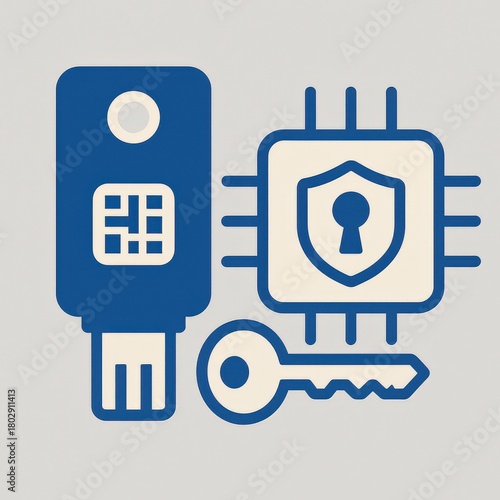 Fototapeta premium Digital security elements representing data protection featuring a key USB drive a microchip with a shield and a metal key emphasizing cybersecurity and intellectual protection