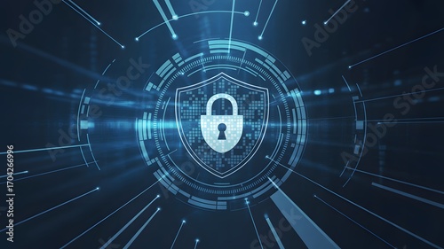 Obraz premium Digital security shield with padlock and abstract technology background
