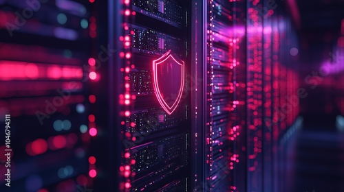 © WrongWay, Obraz premium Digital shield icon protecting database servers in a modern tech setup