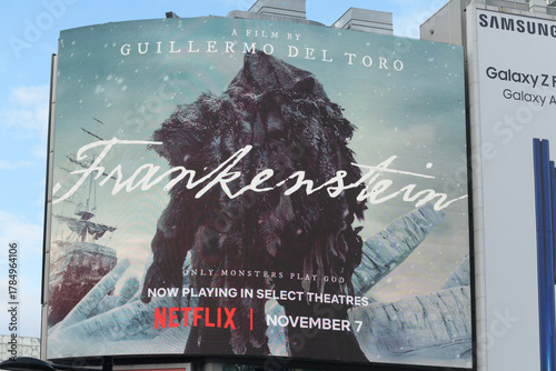 Naklejka premium digital sign displaying Guillermo del Toro film Frankenstein at Sankofa Square, Toronto