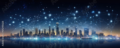 © John Boss, Naklejka premium Digital Smart City Pulse: Interconnected Data Points and Aesthetic Wave Design