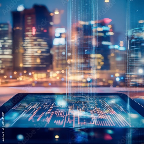© Rattanachai, Obraz premium Digital Tablet Display Overlay With Data In A Cityscape At Night Evening Time Cityscape With Data Visualization On Screen Urban Landscape Illuminated With Digital Information Technology Concept With