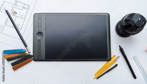 Fototapeta premium Digital tablet with drawing tools, placed on a white surface