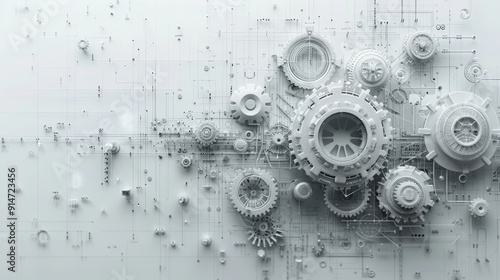 Obraz premium Digital Tech Evolution: Gray Gears and Technology Elements on Abstract White...