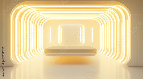 Obraz premium Digital Tech Exhibit in a Floating Capsule with Futuristic Displays and...