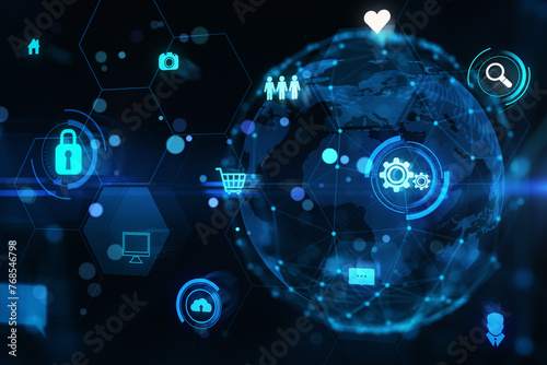 © Who is Danny, Obraz premium Digital technology background with neon blue cyberspace elements and globe, concept of global tech network. 3D Rendering