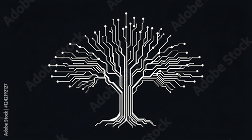 © ipolstock, Naklejka premium Digital Technology Tree Circuit Board Design Pattern on Black Background - Modern Tech and Nature Fusion Concept