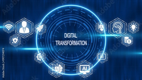 Obraz premium Digital Transformation Concept with Central Text and Hexagonal Technology Icons network data