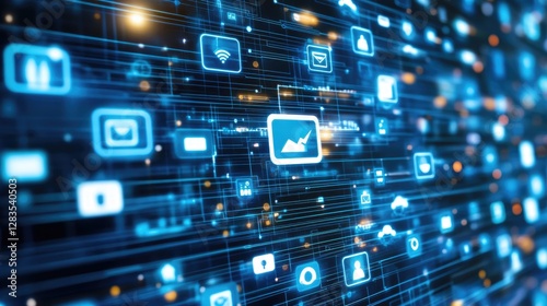 © Sampao, Obraz premium Digital transformation concept with CRM automation icons and cloud-based services in a blue tech background, no people