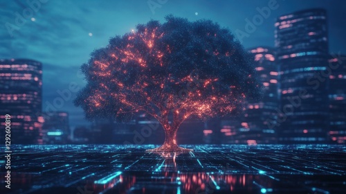 Fototapeta premium Digital Tree in a Futuristic Cityscape