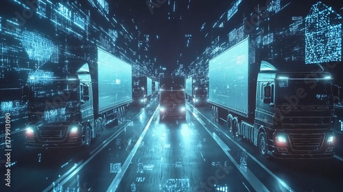 Fototapeta premium Digital trucking convoy, data highway, futuristic logistics