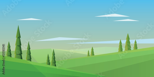 © frimufilms, Obraz premium Digital vector abstract background with pines, green fields and clouds, flat triangle style