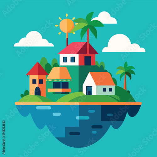 © MDsohelrana, Naklejka premium digital-vector---tropical-island-with-houses-built.eps