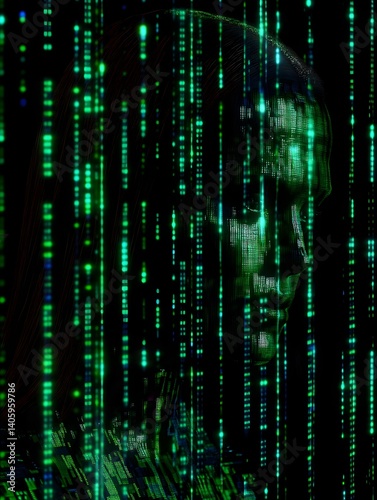 Fototapeta premium Digital Veil: An enigmatic figure is enshrouded by a cascade of binary code, as the image reflects both technological innovation and the mysteries of existence