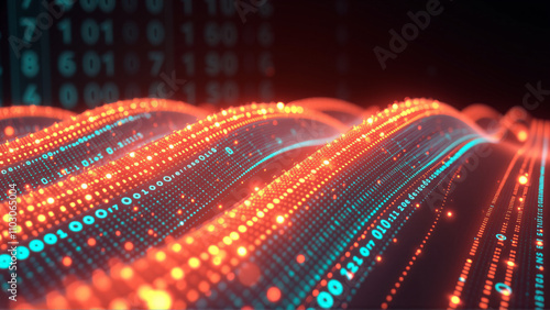 © Arser, Fototapeta premium Digital wave pattern with binary code and glowing particles in a futuristic design
