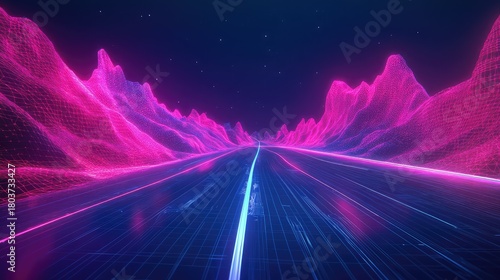 © sevector, Fototapeta premium Digital wireframe landscape with neon road illuminating a synthwave night