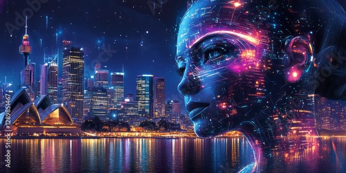 Obraz premium Digital woman overlooks the cityscape of a futuristic sydney