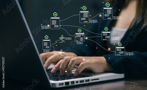 Fototapeta premium Digital workflow automation with verified document approval system, representing business process optimization, online collaboration, and secure enterprise management technology.