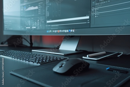 © GS-Studio, Fototapeta premium Digital Workspace: Sleek and modern workspace setup featuring a large monitor displaying data graphs, a wireless keyboard, mouse, smartphone, and stylus. Perfect for illustrating technology.