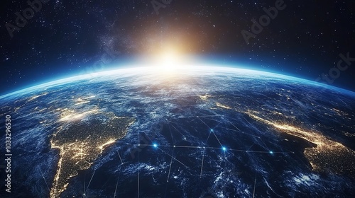 © Thachakrit, Obraz premium Digital world map representing global communication and blockchain economy.