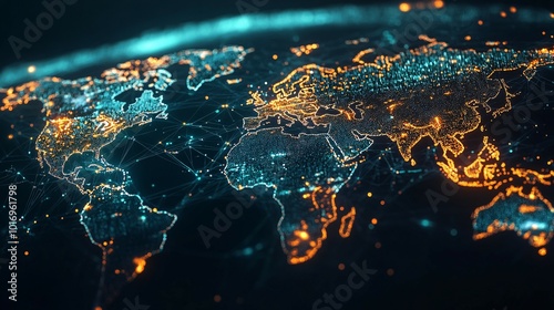 Fototapeta premium Digital World Map with Glowing Cities and Interconnected Lines
