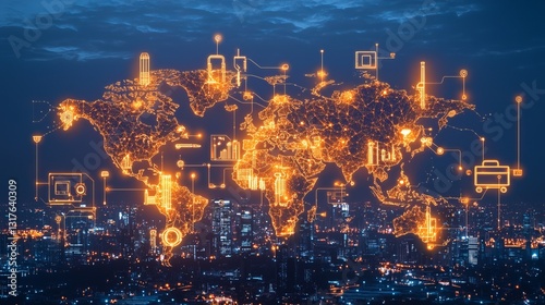 © Sam, Fototapeta premium Digital world map with glowing network connections over a city skyline at dusk.