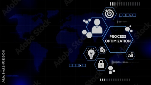 Fototapeta premium Digital World Map with Hexagonal Icons Representing Business Concepts and the Words PROCESOPTIMIZATION