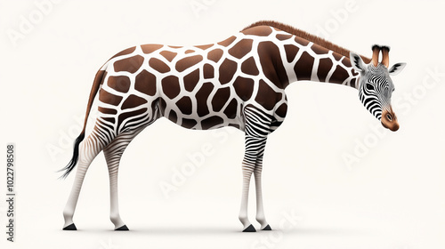 Fototapeta premium Digitally created animal hybrid combining the body of a giraffe and the head and legs of a zebra against a plain background.