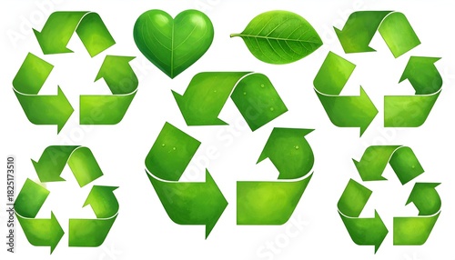 Obraz premium Digitally created collection of green recycled symbols and leaf-like elements