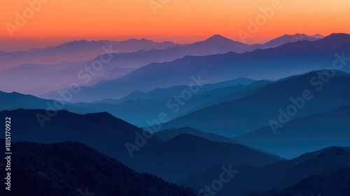 Obraz premium Digitally Rendered Mountain Range Silhouettes Under A Warm Orange Sunset Sky