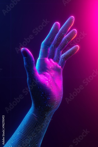 © JP STUDIO LAB, Obraz premium Digitized hand connecting to a virtual grid side view representing the seamless blend of physical and digital worlds robotic tone complementary color scheme