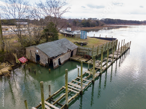 © Mashelsby, Fototapeta premium dilapidated fishing shack in coastal waters