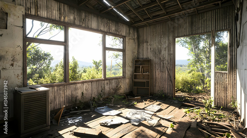 © Agusti, Fototapeta premium Dilapidated Interior Room with Large Windows Overlooking Lush Green Landscape and Bright Sunlight
