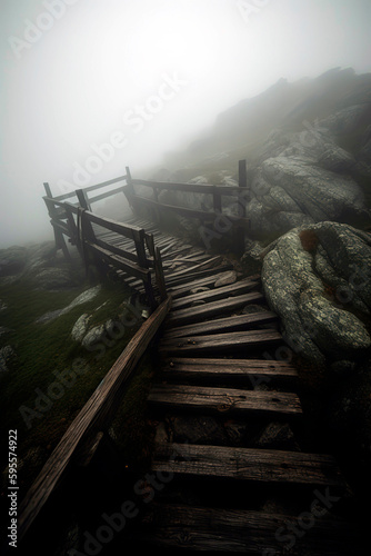 © Melipo-Art, Naklejka premium Dilapidated wooden bridge emerging from the cliff, surrounded by thick fog.